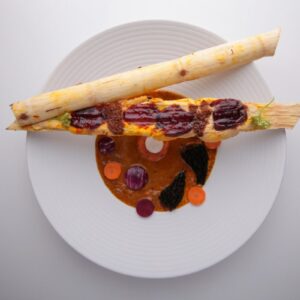 • Then, split the sugar canes in half, and top each with two blackberries, two dates and a slice of turkey. Cover with the other half of the cane and tie it with a string or baking twine so that it doesn't move. Place the sugar canes in the oven for about 20 minutes, being careful not to burn the turkey.