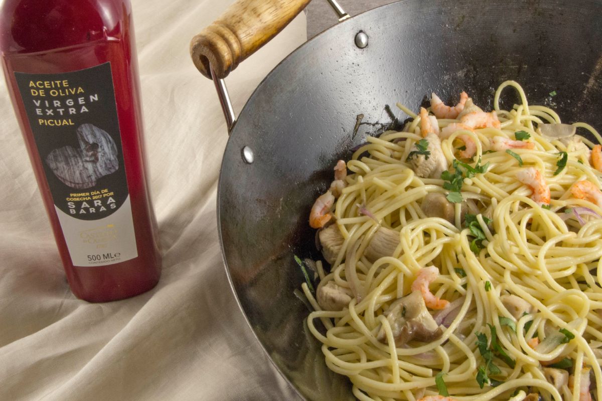 Espaguetis con pollo y camarones con aceite de oliva virgen extra